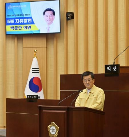 [중앙뉴스라인, 김효현기자] 광주 서구의회 백종한 의원(화정3동, 화정4동, 풍암동)이 18일 제332회 임시회 제1차 본회의에서 5분자유발언을 통해 △관내 하수관거 정비사업 및 악취저감 사업 신속추진 당부 △지하철 공사구간 도로포장 조기완공 촉구요청을 주제로 발언했다.