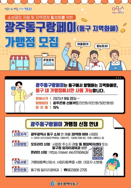 한편 광주동구랑페이는 관내 가맹점에서 사용할 수 있는 동구 지역화폐로, 1인 한도 50만 원까지 광주은행에서 구매할 수 있다.