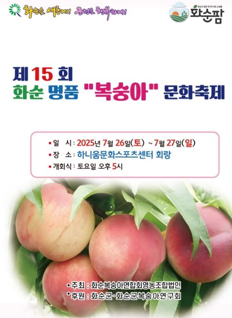 [중앙뉴스라인, 이대수 기자] 화순군이 화순복숭아연합회영농조합법인 주관으로 26일부터 27일까지 2일간 하니움문화스포츠센터에서 제15회 화순 명품 복숭아 축제를 개최한다.