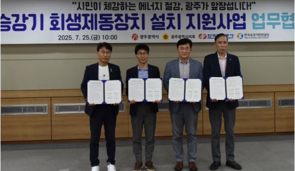 광주광역시는 광주광역시의회, 한국전력공사 광주전남본부, 한국승강기안전공단 호남지역본부와 함께 25일 시의회 대회의실에서 ‘승강기 회생제동장치 설치 지원사업 추진을 위한 업무협약’을 체결했다.