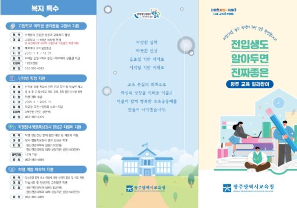 안내서는 고교학점제 안내 및 공동교육과정 수강신청 방법, 광주아이온(AI-ON) 학습 지원, 365일 24시간 진로진학상담 지원 등 교육과정과 꿈드리미, 1학생 1스마트 기기 보급, 학생 마음 건강 지원 등 교육 정책을 담고 있다.