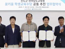[중앙뉴스라인, 김민수기자] 전라남도교육청은 30일 진도군청에서 진도군과 ‘꿈 키움 학생교육수당 공동 추진을 위한 업무협약’을 체결하고, 중·고등학생까지 수당 지급을 확대하는 데 뜻을 모았다.
