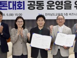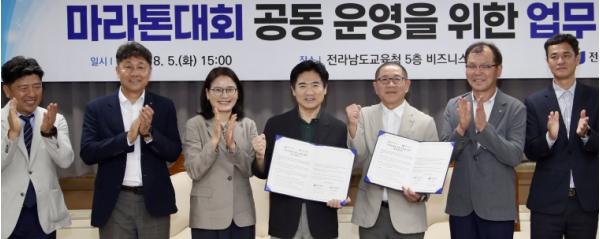 [중앙뉴스라인, 김민수기자] 전라남도교육청과 목포시체육회는 5일 청사 비즈니스실에서 교육감기 ‧ 김대중마라톤 대회 공동 운영을 위한 업무협약을 체결했다.