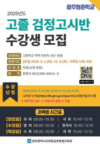 [중앙뉴스라인, 전은희기자] 광주시교육청금호평생교육관은 오는 9월부터 12월까지 운영하는 ‘3기 고졸 검정고시반’ 수강생을 선착순 모집한다.