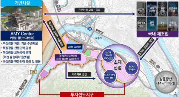 영월은 국가 첨단산업(반도체, 방산, 자동차)에 소요되는 필수 자원(텅스텐) 기반의 핵심소재단지를 조성하고, 산·학·연 연계 연구개발 지원을 위한 첨단소재 센터 구축을 통해 핵심광물 거점지역으로 육성할 계획이다.