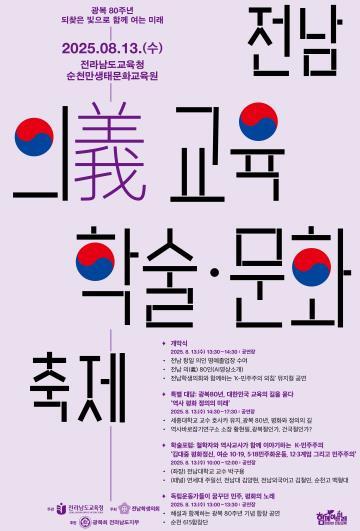 [중앙뉴스라인, 김민수기자] 전라남도교육청은 13~14일 순천만생태문화교육원에서 ‘광복 80주년 되찾은 빛으로 함께 여는 미래’를 주제로 전남 의(義)교육 학술·문화 축제를 개최한다.