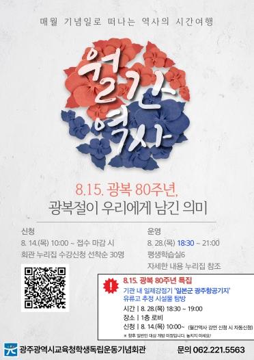 [중앙뉴스라인, 전은희기자] 광주광역시교육청학생독립운동회관은 14일부터 28일까지 ‘월간역사’ 특강 수강생을 모집한다.