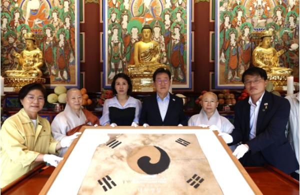 [중앙뉴스라인, 우제헌기자] 이재명 대통령 내외는 17일 오후 서울 은평구에 위치한 진관사를 방문했다. 진관사는 일제강점기 일장기 위에 먹물로 태극문양과 4괘를 덧칠해 만든 '진관사 태극기'와 독립신문이 발견된 역사적인 사찰이다.