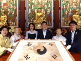 진관사 주지 법해스님이 호국사찰로 큰 역할을 해온 진관사의 역사를 소개하며 진관사의 보물인 태극기와 독립신문을 대통령 내외께 직접 보여드렸다.