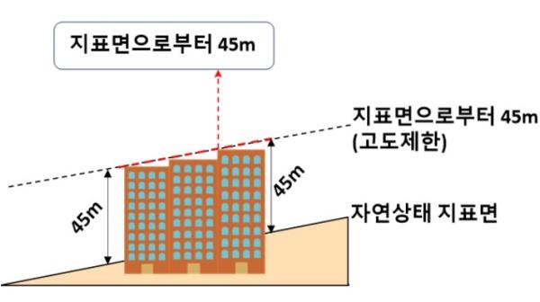 지금까지는 대지 중 ‘가장 낮은 부분’을 기준으로 건축물 높이를 산정하여 고도제한을 초과하는지 검토했으며, 이에 따라 경사지에서는 법률에서 허용되는 높이임에도 계단식 아파트 등 형태에 따라 시행령에 의해 건축이 불가능한 사례가 발생했다.