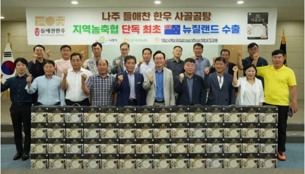 나주시는 20일 나주축협에서 ‘나주들애찬한우 사골곰탕’ 해외 첫 수출을 기념하는 자리를 가졌다고 밝혔다.