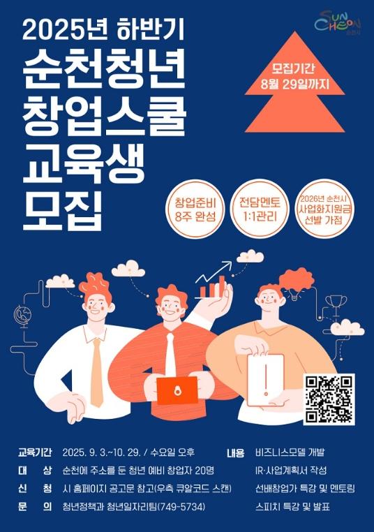 [중앙뉴스라인, 전은희기자] 순천시는 오는 29일까지 청년예비창업자들을 위해 창업교육프로그램 ‘순천청년창업스쿨’에 참가할 교육생을 모집한다고 밝혔다.