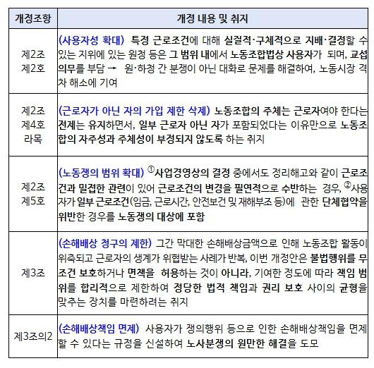 이번 노동조합법 개정은 변화한 노동환경과 산업구조에 대응하여 권한과 책임이 불일치하는 제도적 사각지대를 해소하고, 원하청 등 다층적 산업구조 하에서의 실질적인 교섭권 보장, 과도한 손해배상 청구로 인한 노동권 위축 문제 등을 해소하는 법적 기반을 마련한 데 그 의의가 있다.