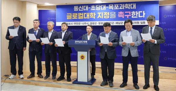 [중앙뉴스라인, 김민수기자] 전라남도 서남부권 도의원들이 8월 26일 전남도의회 브리핑룸에서 기자회견을 열고 동신대-초당대-목포과학대 연합의 글로컬대학 본지정을 강력히 촉구했다.