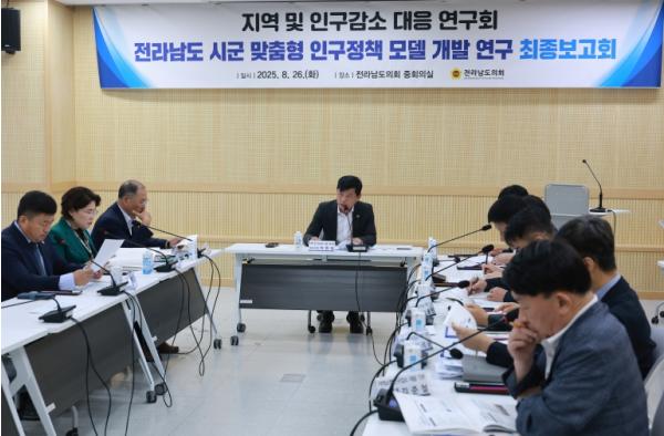 [중앙뉴스라인, 김민수기자] 전라남도의회 ‘지역 및 인구감소 대응 연구회’(대표의원 이현창)는 8월 26일 도의회 중회의실에서 '전라남도 시군 맞춤형 인구정책 모델 개발 연구' 최종보고회를 개최했다.