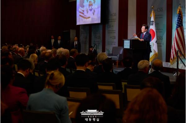 이 대통령은 이날 미국 워싱턴DC의 싱크탱크 전략국제문제연구소(CSIS)에서 한 연설에서 "저와 트럼프 대통령은 '국익중심 실용동맹'의 새 지평을 열어가고자 한다"며 이 같이 밝혔다.