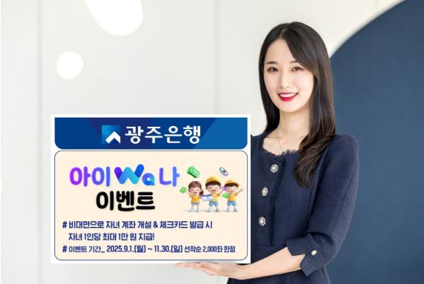 [중앙뉴스라인, 양병남기자] 광주은행은 오는 11월 30일까지 비대면으로 미성년자 계좌 및 체크카드 개설 시 용돈을 지급하는 ‘아이Wa나 이벤트’를 진행한다고 밝혔다.