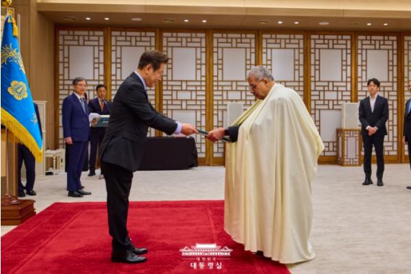 [중앙뉴스라인, 우제헌기자] 이재명 대통령은 오늘 오후 대통령실에서 개최된 신임장 제정식에서 신임 주한 상주대사 7명으로부터 신임장을 제출받았다. 신임장 제정식은 파견국의 국가원수가 자국의 신임 대사에게 수여한 신임장을 주재국 국가원수에게 전달하는 절차로, 이번 제정식은 우리 신정부 출범 이후 처음 개최된 것이다.