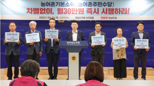 [중앙뉴스라인, 김민수기자] 전라남도의회 박형대 의원(진보당, 장흥1)은 9월 4일 11시 전남도의회 브리핑룸에서 진행된 진보당 전남도당 기자회견에 참석해 농어촌기본소득의 전면 시행을 강력히 촉구했다.