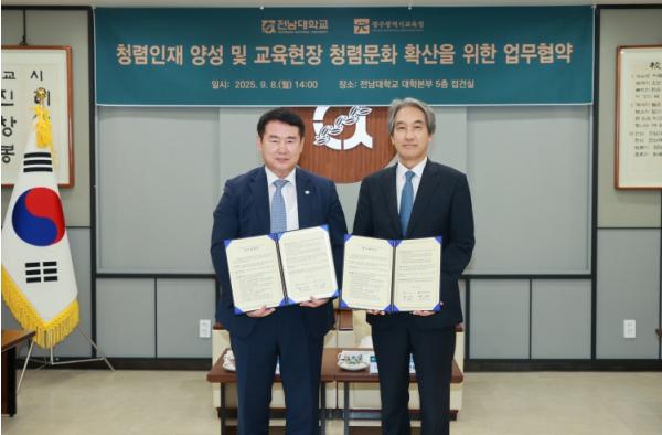 [중앙뉴스라인, 김민수기자] 전남대학교와 광주시교육청이 청렴 인재 양성과 교육현장 청렴 문화 확산을 위해 협력한다. 양 기관은 업무협약을 체결하고 미래세대가 청렴한 시민으로 성장할 수 있도록 공동 노력을 기울이기로 했다.