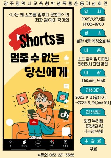 강연은 ‘나는 왜 쇼츠를 멈추지 못할까’의 저자 김아미 작가가 맡는다. 김 작가는 ‘쇼츠를 멈출 수 없는 당신에게’를 주제로 ▲디지털 미디어 리터러시의 기본 개념과 필요성 ▲알파 세대 청소년이 경험하는 쇼츠·SNS·AI 환경 ▲청소년의 건강한 성장을 위해 성인이 해야 할 역할 등을 소개한다.