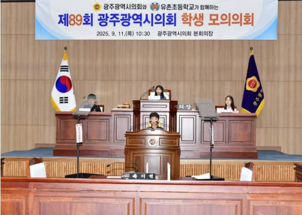 [중앙뉴스라인, 김효현기자] 광주광역시의회는 9월 11일 오전 10시 30분 시의회 본회의장에서 유촌초등학교 학생들을 대상으로 ‘제89회 광주광역시의회 학생 모의의회’를 개최했다.