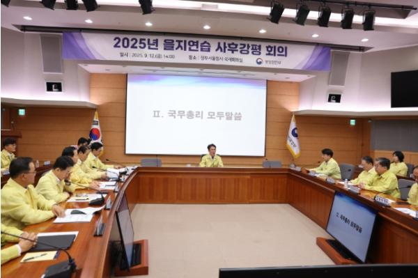 [중앙뉴스라인, 우제헌기자] 김민석 국무총리는 9월 12일 오후 정부서울청사에서 중앙행정기관장, 시·도지사 등 150명이 참석한 가운데 2025년 을지연습 사후강평회의를 주재했다.