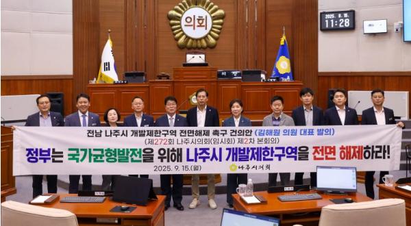 마지막으로 김해원 의원은 “지방의 생존과 국가 균형발전을 위해 더 이상 미룰 수 없는 과제”라며, “정부는 형평성과 현실성을 반영해 조속히 나주시의 개발제한구역 전면 해제에 나서야 한다”고 밝혔다.