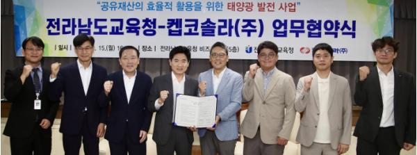 [중앙뉴스라인, 김민수기자] 전라남도교육청이 9월 15일 오후 청사 5층 비즈니스실에서 켑코솔라㈜와 ‘공유재산 태양광 발전사업 협약’을 체결했다.