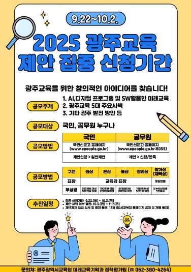 공모 부문은 ▲AI‧디지털 프로그램 및 소프트웨어(SW)를 활용한 미래교육 방안 ▲다양성교육, 책임교육, 공정교육, 미래교육, 상생교육 등 광주교육 5대 시책 구현 아이디어 ▲광주교육 발전 방안 등 3개다.