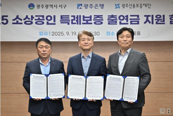 [중앙뉴스라인, 양병남기자] 광주은행은 19일, 광주광역시 서구청에서 김이강 광주광역시 서구청장과 이상채 광주은행 부행장, 염규송 광주신용보증재단 이사장 등이 참석한 가운데, 광주광역시 서구 및 광주신용보증재단과 ‘서구 소상공인 특례보증 업무협약’을 체결했다고 밝혔다.