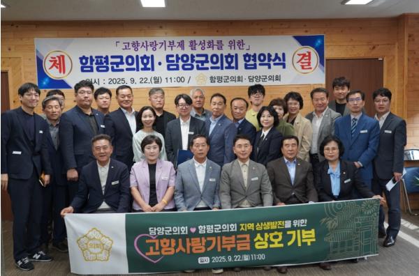 [중앙뉴스라인, 전은희기자] 담양군의회는 22일 함평군의회에서 고향사랑기부금 상호 기탁식을 갖고, 기부 문화 확산과 동시에 지역사랑 실천에 앞장서는 뜻깊은 행보를 이어갔다.