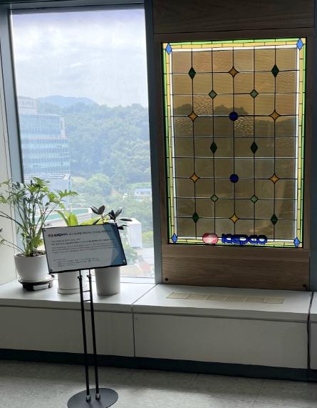 이번에 설치한 패널은 15×15cm2 크기의 페로브스카이트 모듈 54장을 병렬로 배열했으며, 모듈 효율은 11~13%, 투과율은 30% 이상으로 창을 통해 외부 전경을 볼 수 있는 등 기술 성능을 높였다. 또한 KEPCO 로고를 활용한 스테인드글라스 디자인을 패널 후면에 적용해 건축물 미관을 높이며 디자인 완성도를 확보했다.