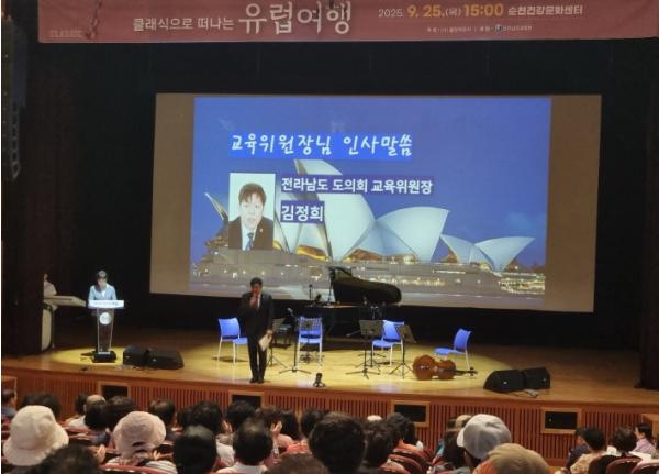 [중앙뉴스라인, 김민수기자] 김정희 전라남도의회 교육위원장은 9월 25일, 순천건강문화센터에서 열린 ‘클래식으로 떠나는 유럽 예술 여행’ 행사에서 축사를 통해 청소년과 시민들에게 따뜻한 격려와 희망의 메시지를 전했다.