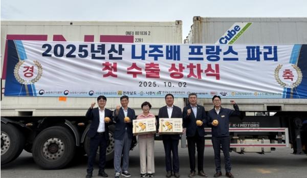 나주시(시장 윤병태)는 최근 장현순 네시피F&B 대표, 이동희 나주배원예농협 조합장, 최명수 전남도의원 등 관계자가 참석한 가운데 나주배 프랑스 첫 수출 상차식을 진행했다고 14일 밝혔다.