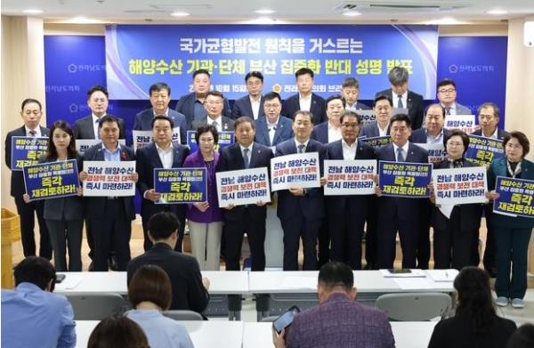 [중앙뉴스라인, 김민수기자] 전라남도의회 농수산위원회 최동익 의원(더불어민주당·여수)은 10월 15일 제394회 임시회 도의회 브리핑룸에서 '국가균형발전 원칙을 거스르는 해양수산 기관·단체 부산 집중화 반대 성명서'를 발표했다.
