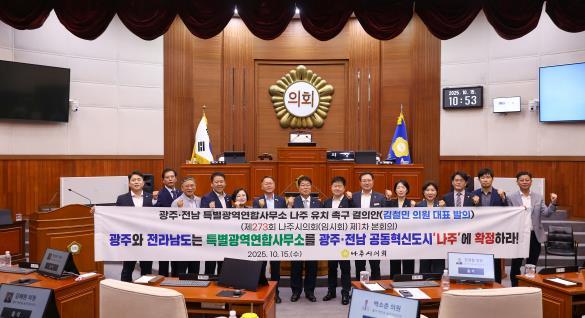나주시의회는 이번 건의안을 통해 ▲광주·전남 특별광역연합 규약에 사무소 소재지를 명시적으로 광주·전남 공동혁신도시(나주시 빛가람동)으로 확정할 것과 ▲후속협의 전 과정에서 상징성·정합성·거버넌스 접근성을 가산요소로 명문화하고, 다른 현안과의 정치적 교환·거래를 일체 배제할 것, ▲정부·광주시·전남도는 나주 유치에 필요한 인프라와 예산을 조속히 확정하고, 연합 출범 일정과 연동해 행정 공백 없이 집행 계획을 제시할 것을 촉구했다.