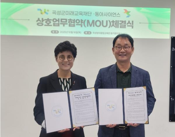 [중앙뉴스라인, 김민수기자] 곡성군미래교육재단은 지난 16일 국내 대표 과학기술 전문 콘텐츠 기업 ㈜동아사이언스(대표이사 장경애)와 과학문화 확산 및 AI 융합 인재 육성을 위한 업무협약(MOU)을 체결했다고 17일 밝혔다.