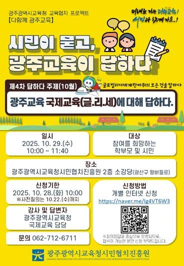 한편 시민협치진흥원은 오는 12월 16일에는 올해 운영된 ‘시민이 묻고, 광주교육이 답하다’ 행사 내용을 종합해 이정선 교육감과 함께 하는 타운홀 미팅 ‘2025 광주교육 100인 100분 토론회’ 행사를 운영한다.