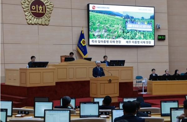 [중앙뉴스라인, 김민수기자] 전라남도의회 박형대 의원(진보당·장흥1)은 10월 23일 열린 제394회 임시회 제2차 본회의 5분 자유발언을 통해 “벼깨씨무늬병과 채소 병해가 확산되며 농업재해가 일상이 된 만큼, 기후위기에 대응한 농정 전환이 절박하다”고 촉구했다.