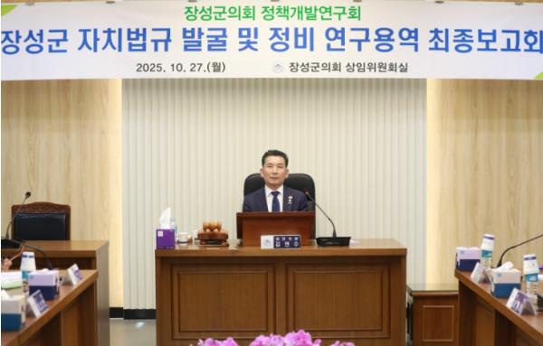 [중앙뉴스라인, 전은희기자] 장성군의회 의원연구단체 ‘정책개발연구회’는 지난 27일 군의회 상임위원회의실에서 ‘장성군의회 자치법규 발굴 및 정비 연구용역 최종보고회’를 개최했다.
