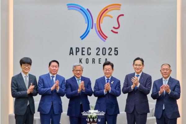 [중앙뉴스라인, 우제헌기자] 이재명 대통령은 10월 31일 오후 2시 경주 APEC 정상회의를 계기로 방한한 젠슨 황 엔비디아 대표를 만나, 대한민국 AI 인프라를 비롯한 생태계 전반의 혁신 방안에 대해 의견을 교환했다. 이 자리에는 삼성전자 이재용 회장, SK 최태원 회장, 현대차그룹 정의선 회장, 네이버 이해진 의장이 함께했다.