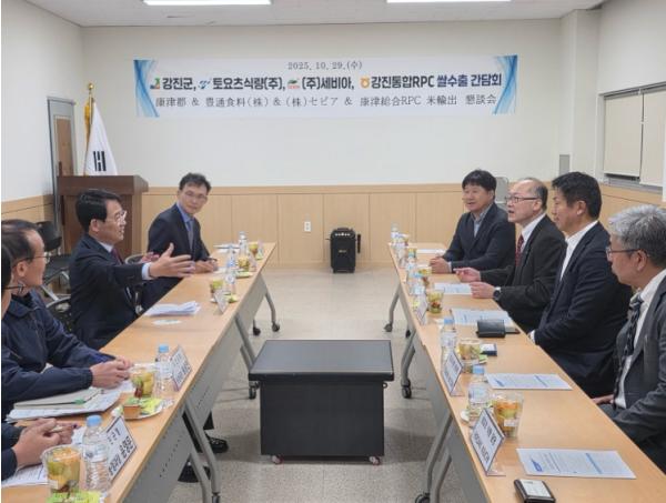 지난달 29일 강진군 통합RPC(강진군농협쌀조합공동사업법인)에서 ㈜토요츠 식량, ㈜세비아 관계자들과 강진군 통합RPC 임직원 등이 참석한 가운데 ‘강진쌀 수출 협력 간담회’가 열렸다.