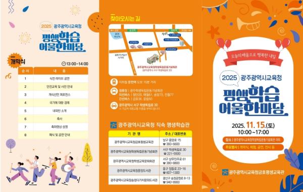 [중앙뉴스라인, 전은희기자] 광주시교육청금호평생교육관은 오는 15일 광주시교육청학생독립운동기념회관 야외 일원에서 시민 등을 대상으로 ‘2025 광주광역시교육청 평생학습 어울 한마당’을 개최한다.
