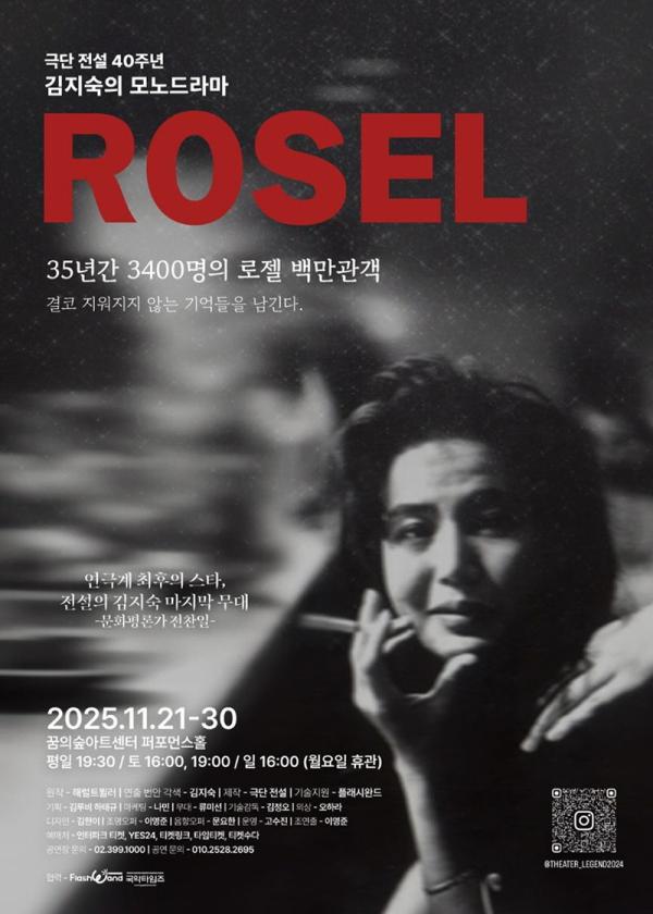 [중앙뉴스라인, 한성영기자] 극단 전설 40주년 기념작이자 배우 김지숙의 마지막 공연인 모노드라마 〈로젤〉이 오는 11월 21일부터 30일까지 꿈의숲아트센터 퍼포먼스홀에서 막을 올린다. 35년간 3,400회 이상 공연되며 백만 명이 넘는 관객을 울린 이 작품은 여성의 주체성과 인간성의 회복을 그린 한국 연극사의 대표작으로 꼽힌다.