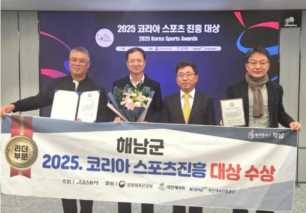 [중앙뉴스라인, 우제헌기자] 해남군이 2025 코리아 스포츠진흥대상에서 리더부문 대상을 수상하며 스포츠마케팅 역량을 인정받았다.