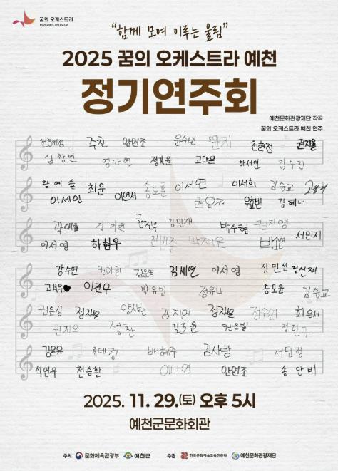 [중앙뉴스라인, 우제헌기자] 예천문화관광재단은 오는 29일 오후 5시, 예천군문화회관에서 '2025 꿈의 오케스트라 ‘예천’ 정기연주회 '함께 모여 이루는 울림''을 개최한다.