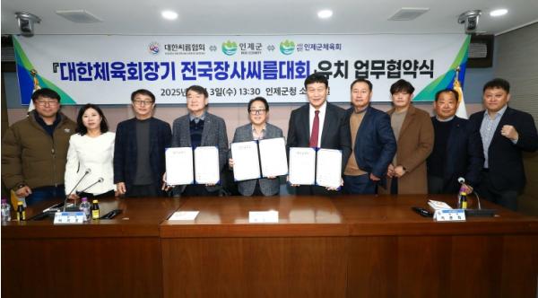[중앙뉴스라인, 우제헌기자] 인제군과 대한씨름협회, 인제군체육회가 12월 3일 ‘대한체육회장기 전국장사씨름대회’ 유치를 위한 업무협약을 체결했다.