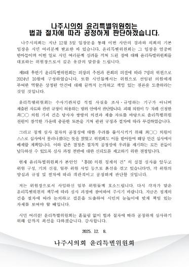 윤리특별위원회는 입장문에서 “나주시의회는 지난 12월 5일 입장문을 통해 이번 사안의 경과와 의회의 기본 입장을 시민 여러분께 발표한 바 있다”며 “윤리특별위원회는 그 입장을 엄중히 받아들이며, 이번 일로 시민 여러분께 심려를 끼쳐 드린 점에 대해 윤리특별위원회를 대표하는 위원장으로서 깊은 유감의 말씀을 드린다”고 전했다.