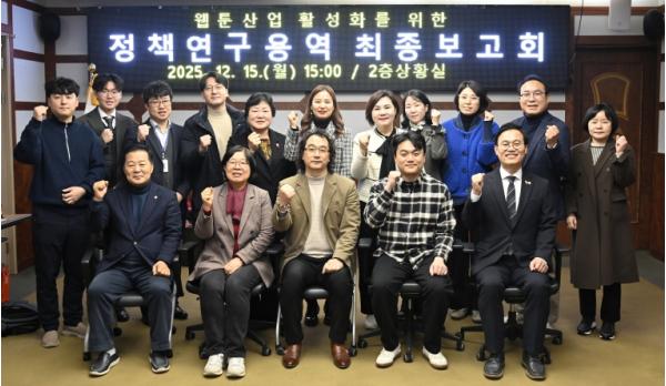 연구회는 이번 용역을 통해 각 분야별 핵심 과제를 도출했다. 먼저 웹툰 산업 분야에서는 ▴관내 웹툰 인력 양성 ▴콘텐츠 비즈니스센터 설치 ▴웹툰 진흥협의체 구성 ▴종합계획 수립 ▴창작자 권리 보호를 위한 법률지원단 운영 등이 주요 대안으로 제시했다.